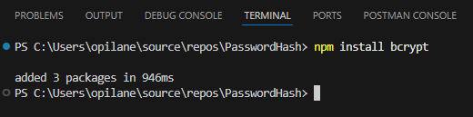 Paigaldada bcrypt käsuga npm install bcrypt