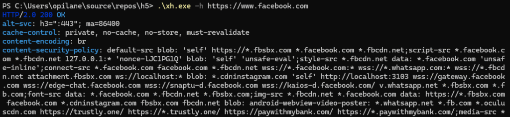 PS C:\Users\opilane\source\repos\h5> .\xh.exe -h https://www.facebook.com