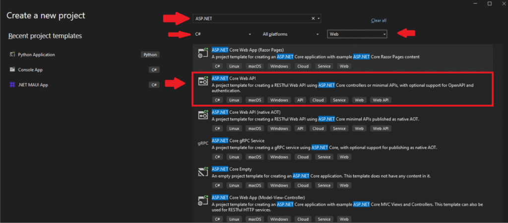 Saame valida, millist juba valmismalli kasutame. Võtame juba loodud kontrolleri koos API otspunktiga.