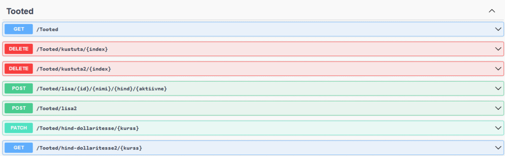 Seejärel avatakse lokaalserveris Swagger, kus on defineeritud meile kaasa antud API otspunktid: https://localhost:7074/swagger/index.html