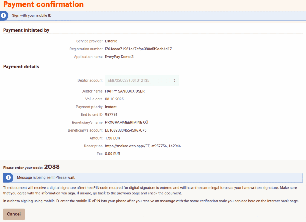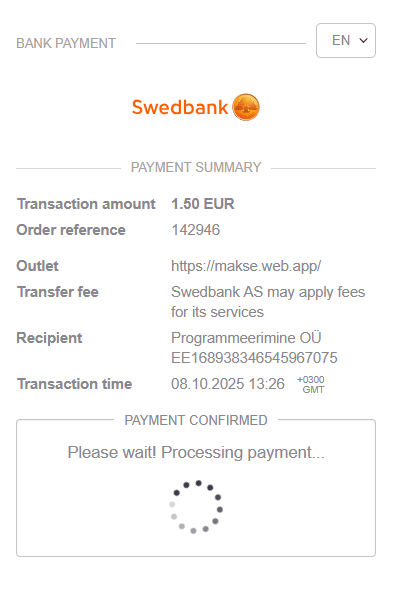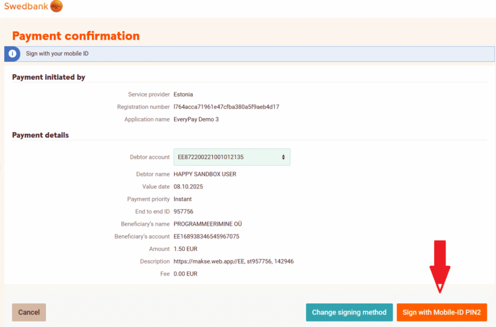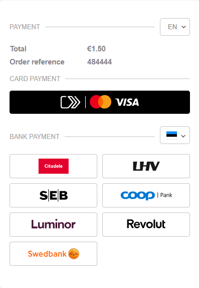 Saame näiteks sellis URL: “https://payment.sandbox.lhv.ee/lp/83xicp5kpf/8Qpnoe2Eqe“
