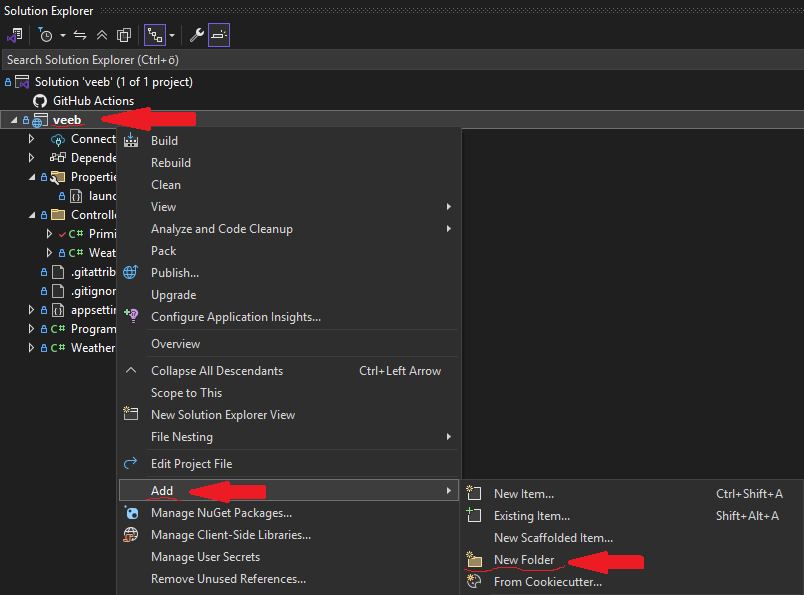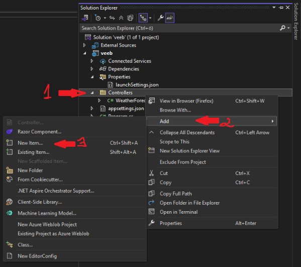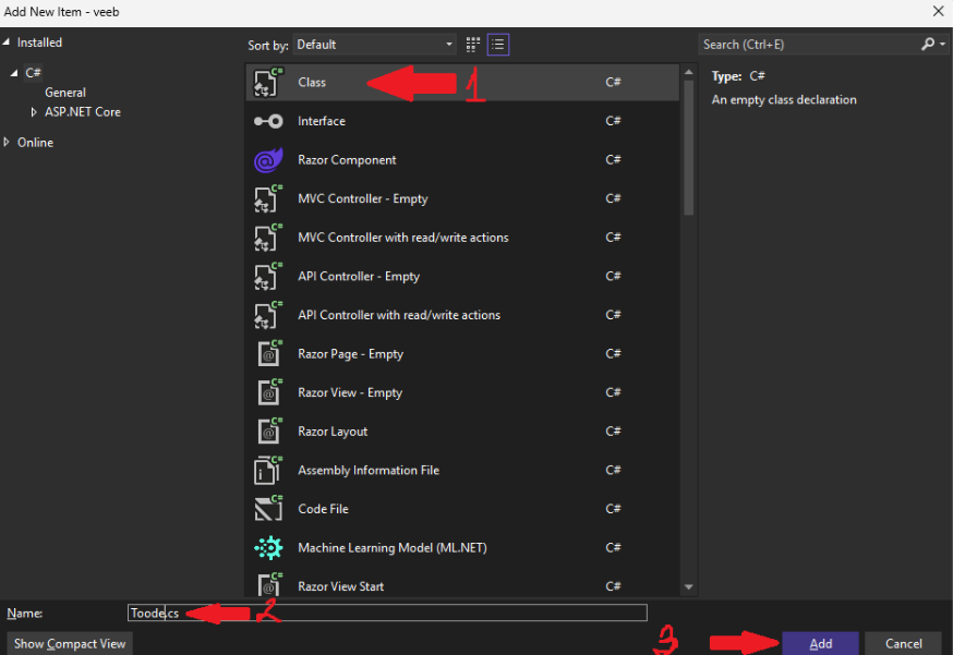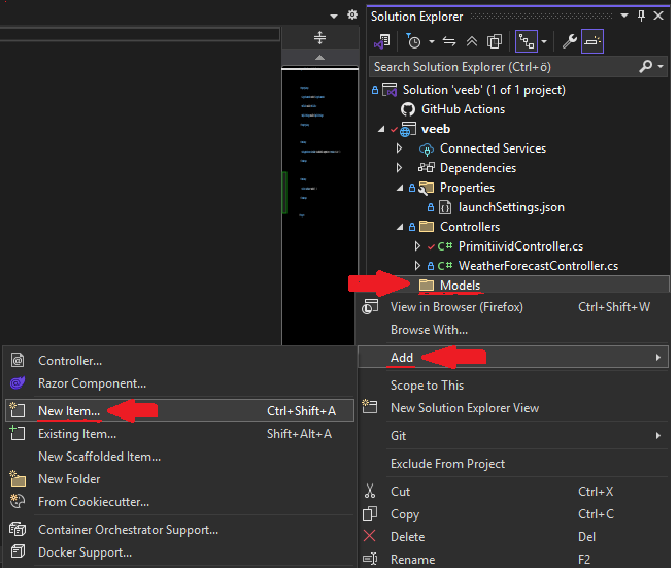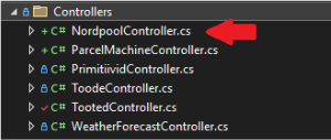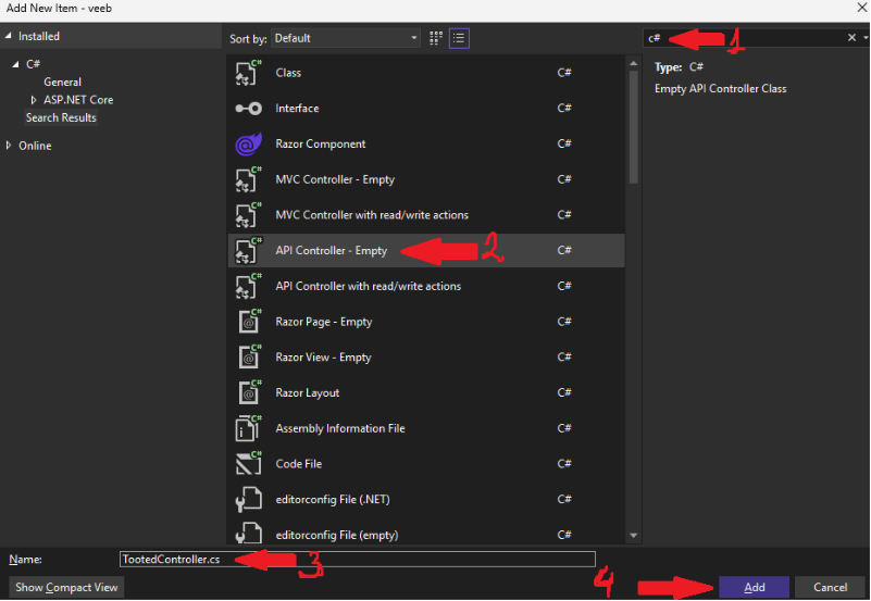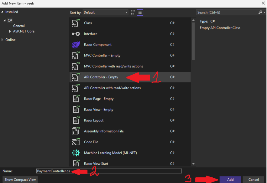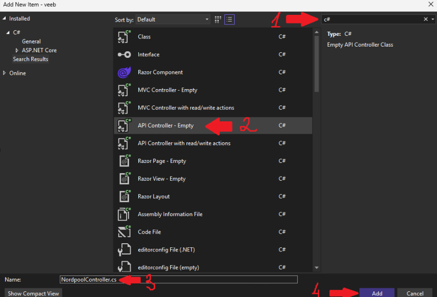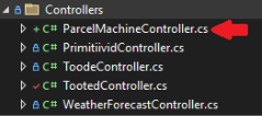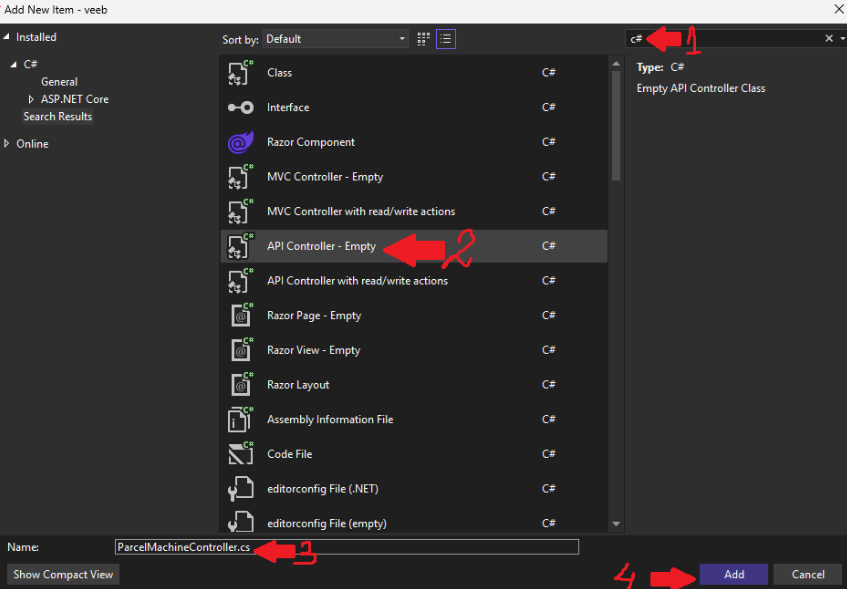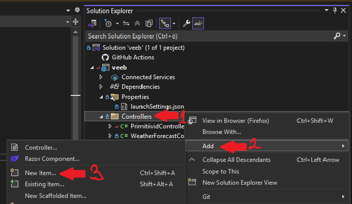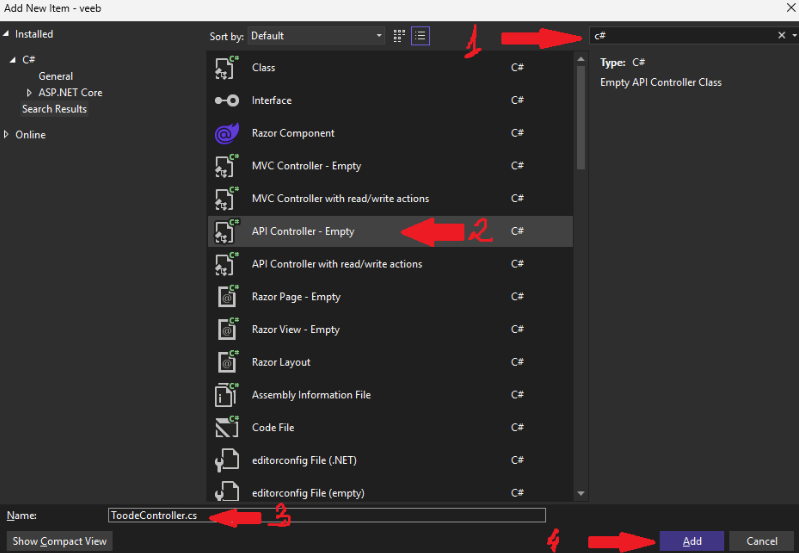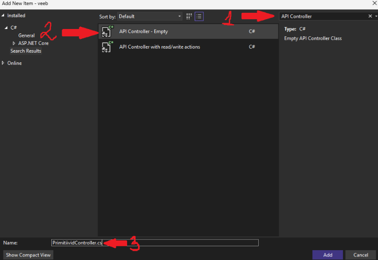 Uue faili loomiseks vajuta kausta “Controllers” kausta peal parema klõpsuga, vali “add” ning võta “New Item…”. Pane loodud faili nimeks PrimitiividController.cs ning vali tühja API kontrolleri mall (API Controller – Empty).