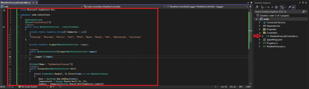 Muudame kontrolleri nime WeatherController vastu (sellega seoses peame ka muutma lisaks kolm nime kasutuskohta koodis).
