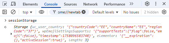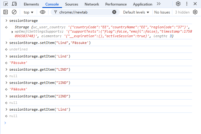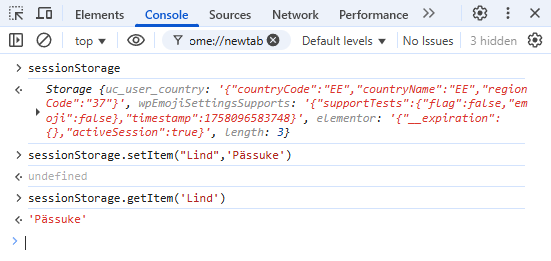3.vali “Console” ja kirjuta käsk: sessionStorage ning vajuta ENTER