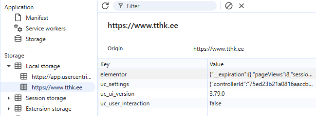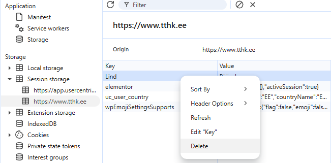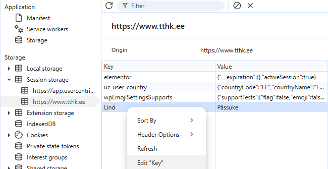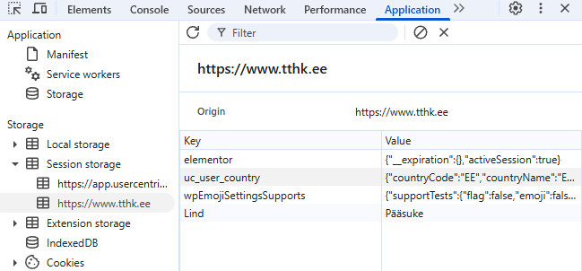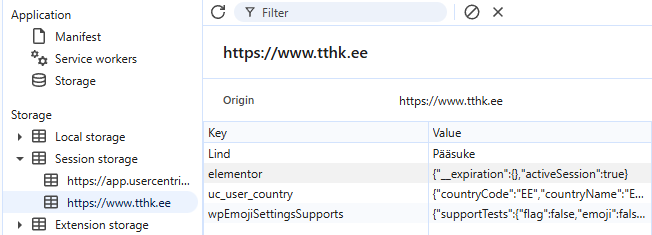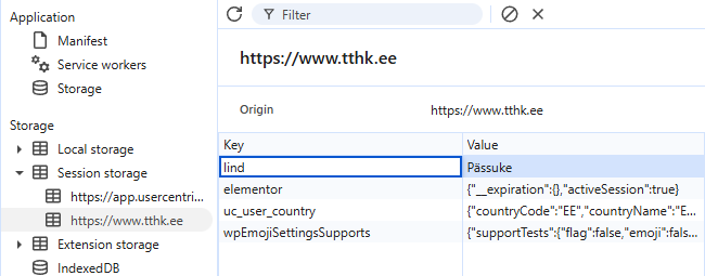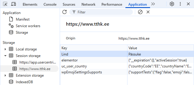 6.Kontrollimiseks peate minema jaotisse Application> Session Storage. Saate vaadata meie sisestatud teavet.