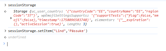3.Teee uus käsk sessionStorage.setItem(‘’,’kirjuta oma lemmikloom’). Selle käsuga lisati Session Storage’isse uued andmed.