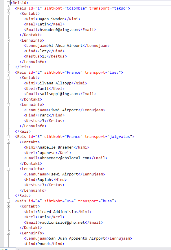 <Reis id="1" sihtkoht="Colombia" transport="takso">