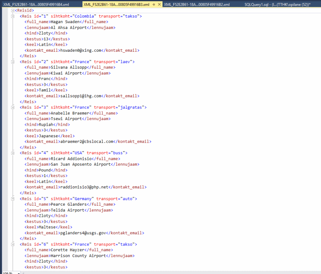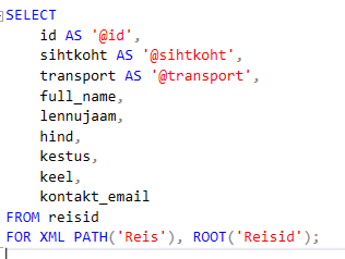 Alustame SQL -> XML 3 tasemeline ja kasutakse vähemalt 1 atribuut: