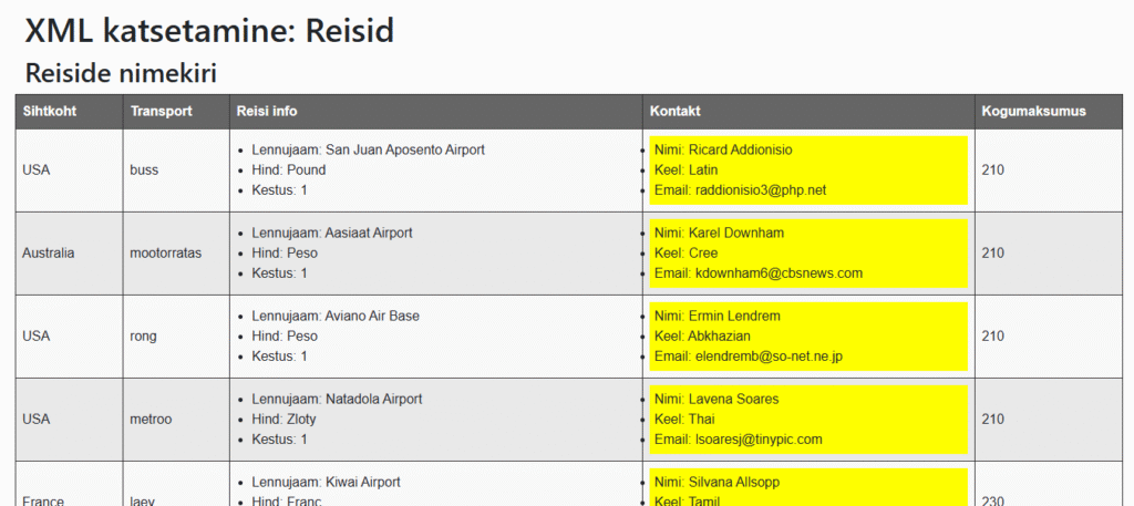 - Kuva kõik xml andmed tabelina, kus read on üle rea erineva värviga.